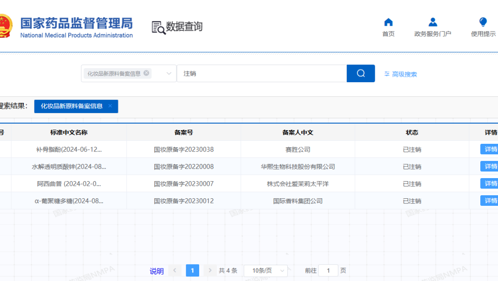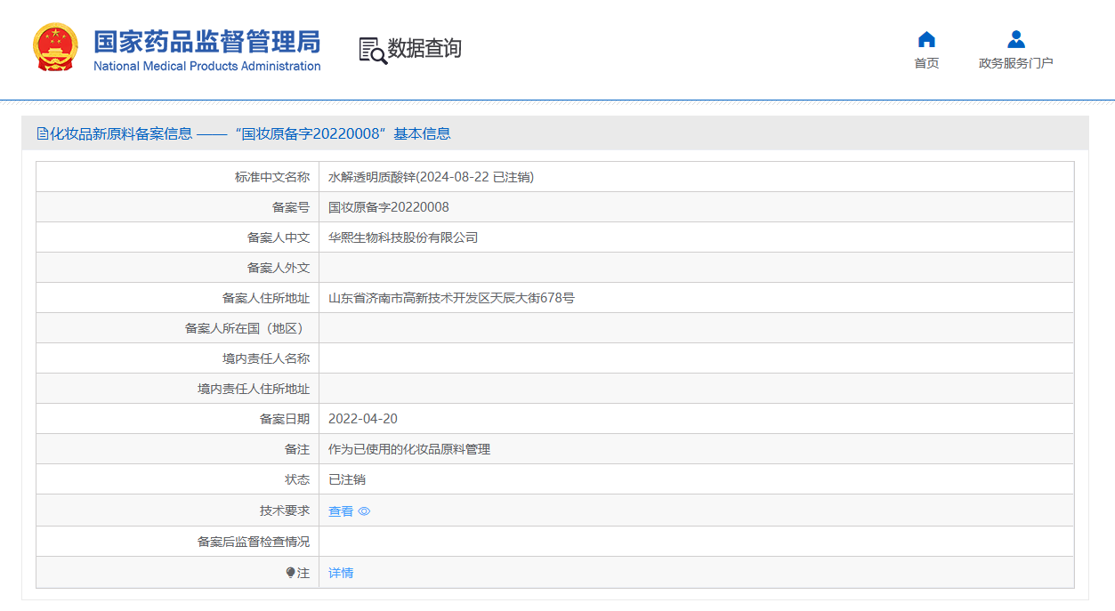“水解透明质酸锌”及“α-葡聚糖多糖”两款新原料于2024年08月22日同时显示为已注销状态,从其公开信息可看到,“作为已使用的化妆品原料管理”字样。
