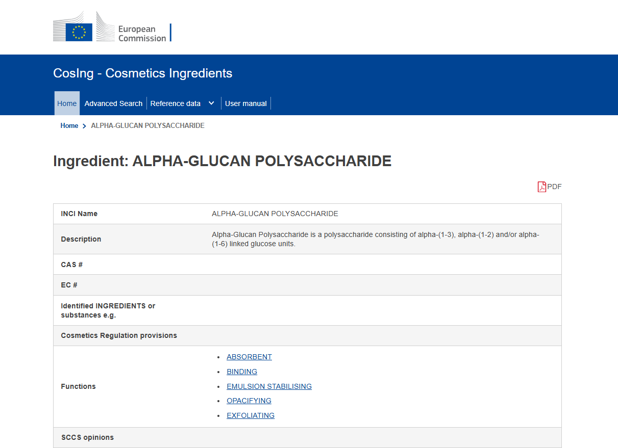 由CosIng查询INCI名称ALPHA-GLUCAN POLYSACCHARIDE,结果页见下