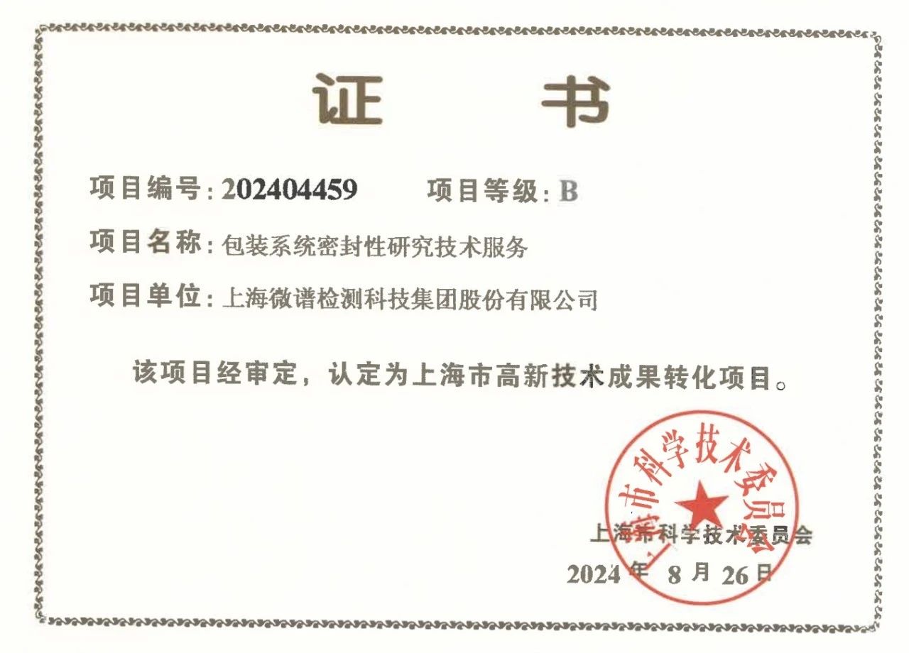 “包装系统密封性研究技术服务”被认定为“上海市高新技术成果转化项目”。