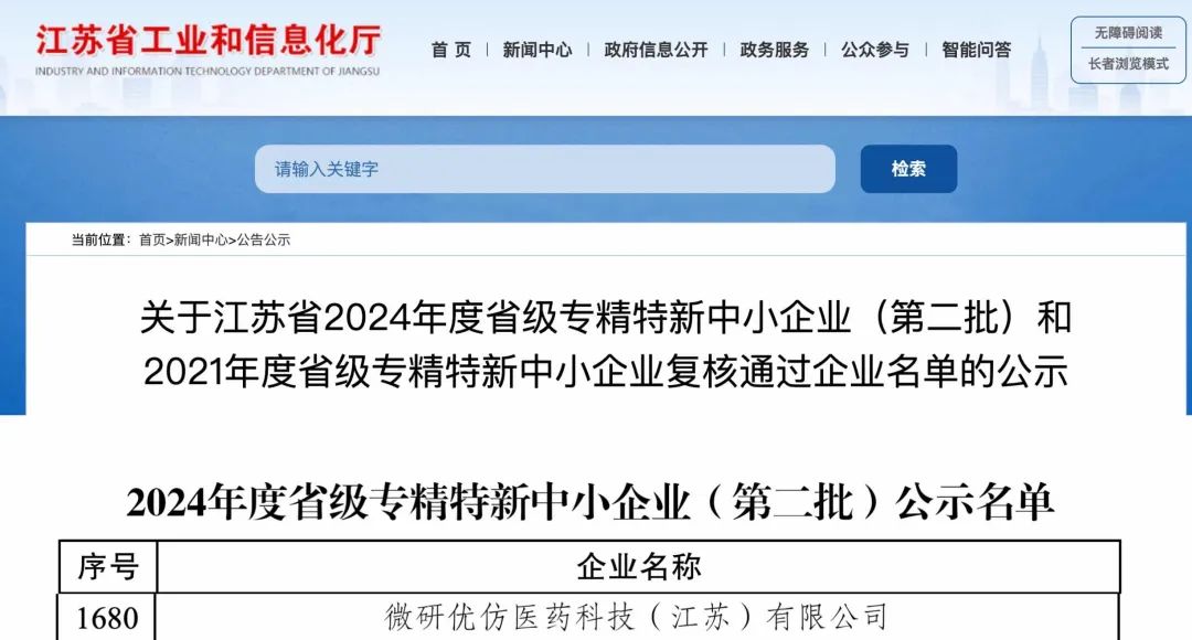 微研优仿医药科技(江苏)有限公司荣获“江苏省专精特新中小企业”。(公示中)