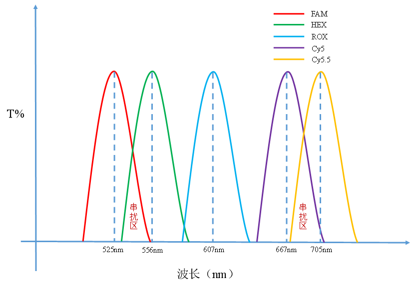 图1 FAM/HEX/ROX/Cy5/Cy5.5染料发射波长示意图(含串扰区)